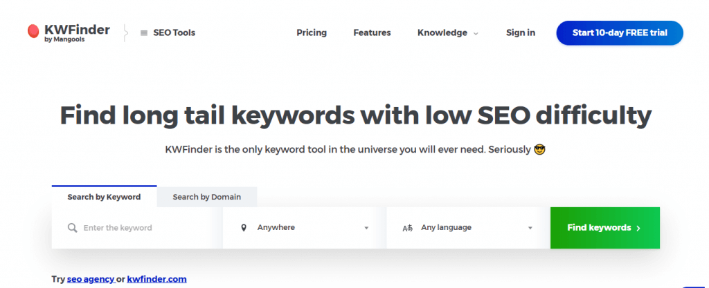 KWFinder tool helps find hidden long-tail keywords. KWFinder shows the keyword difficulty score, finds the competitors’ keywords, focuses on local keyword research, organizes the keyword with a list, import the keyword in bulk, filter the keyword, and finds the keyword through search volume.